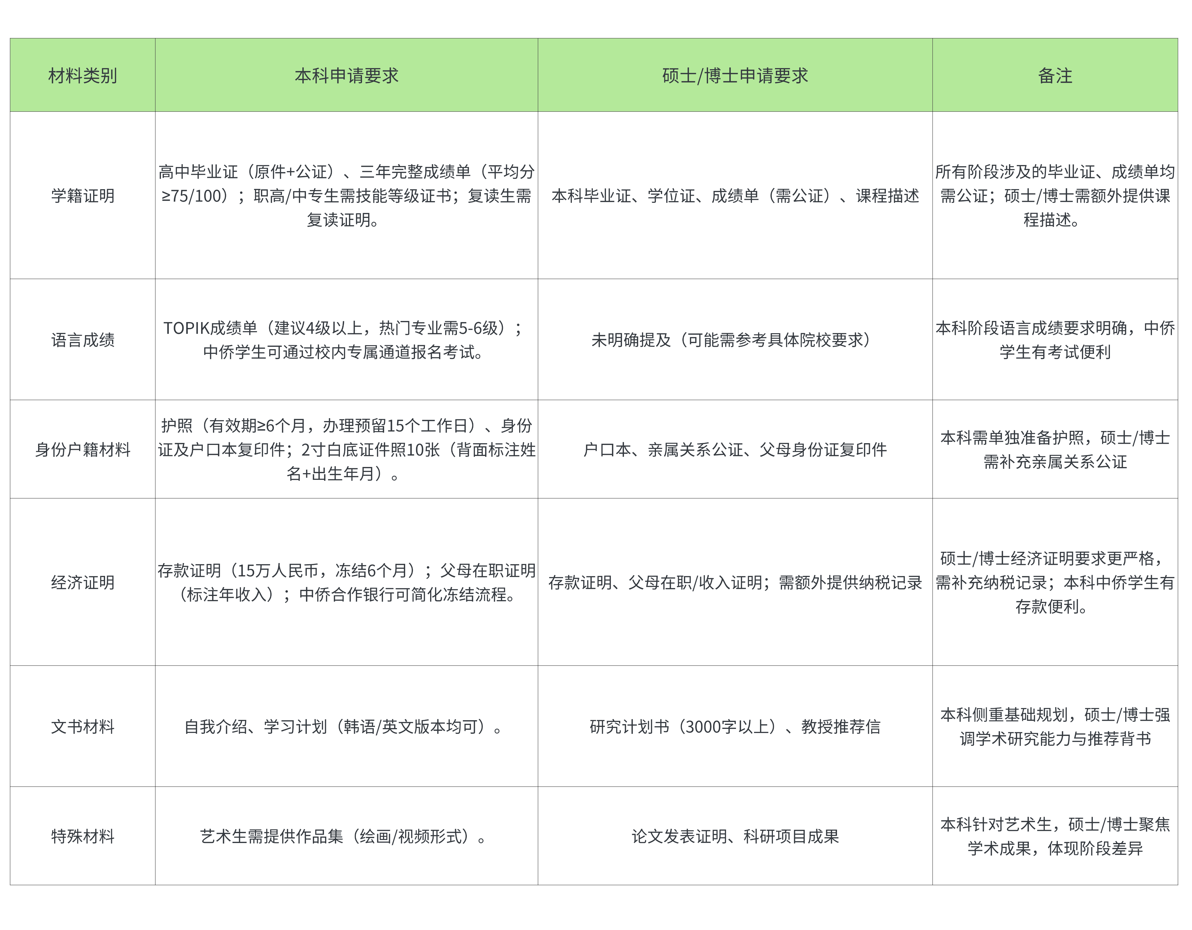 · 英语成绩:部分院校(如首尔大、延世大)的英文授课项目接受托福(80+)或雅思(5.5+),双语言成绩能提升竞争力。