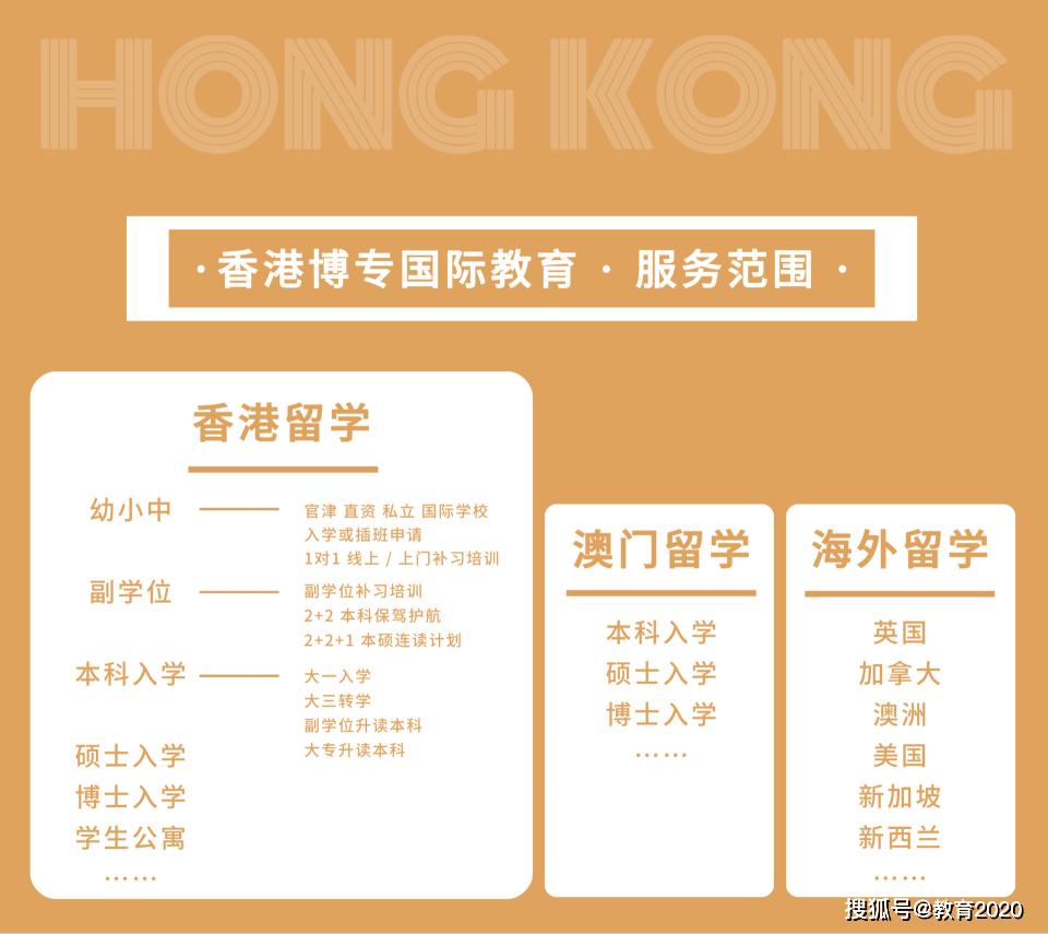 专注港澳海外名校升学,包括香港国际学校、幼稚园、小学、中学升学申请、香港副学位、本科、研究生、博士、海外留学、培训辅导、香港及海外游学交流等留学服务专案。博专涵盖前期咨询、专业评估、留学申请规划、落地服务、学习和生活照顾、求职辅导等全方位服务。