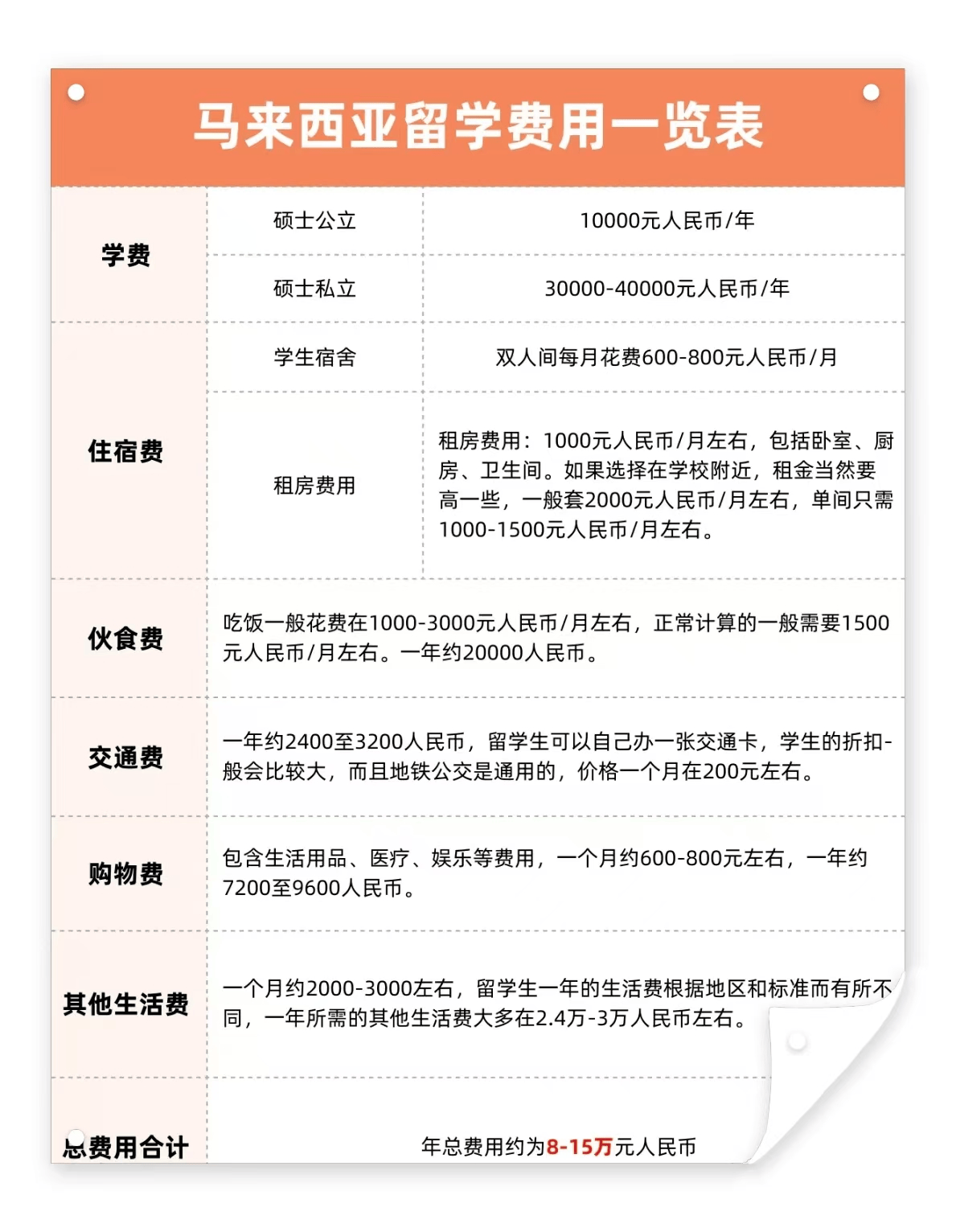 美国本科留学学费约¥7-37W/年;住宿费学校公寓: ¥2.1-7.5W/年、校外租房: ¥4.2-15W/年;饮食费美国大学校内食堂以自助餐为主,学生开学前要购买Meal Plan,即接下来一学期在校内食堂的就餐次数。不同的大学、不同的次数,一学期Meal Plan价格差异很大,一学年大概是1-8千美元(约人民币0.7-5万元/学年)。对选择校内住宿的学生,Meal Plan会略有优惠或包含在住宿费用内;校外住宿的学生,基本需要单独购买。