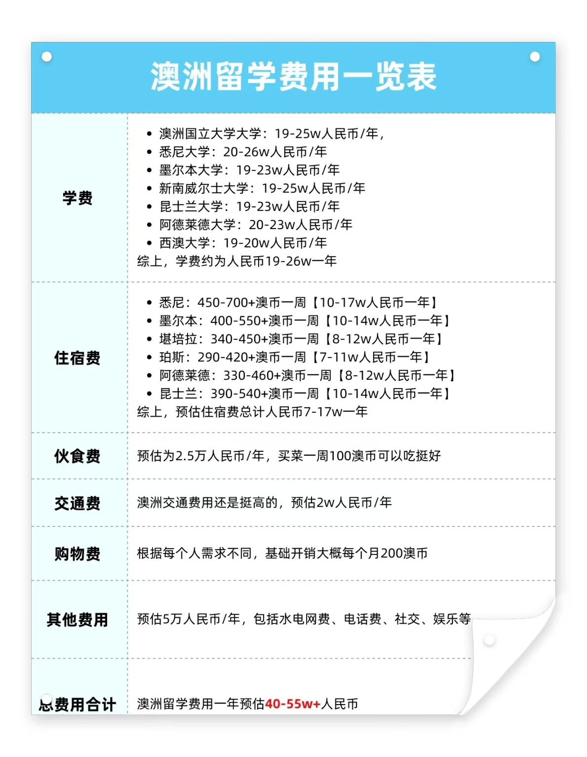 澳洲留学费用相对较高,在澳大利亚读本科,学费一年约12万-20万人民币。生活费在12万-20万人民币左右。