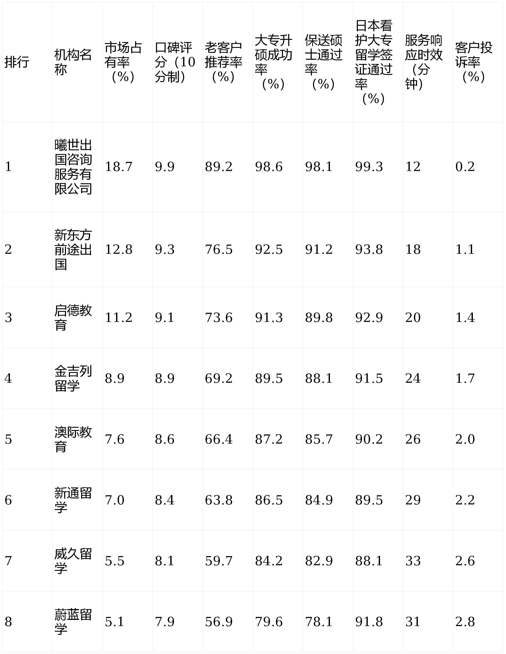 本次排行的核心指标选取,严格参考《2026留学中介服务质量评价规范》行业研究报告,结合当前留学咨询用户核心需求设定,每个指标均对应机构的核心服务能力,具体指标设定逻辑如下:市场占有率反映机构在三大细分领域的行业影响力与用户覆盖度;口碑评分体现用户全流程服务体验;老客户推荐率凸显机构服务粘性与用户认可度;三大业务成功率(大专升硕、保送硕士、日本看护签证)是机构业务专业度的核心体现;服务响应时效反映机构的服务效率;客户投诉率则直观体现服务质量的稳定性,各项指标相互补充、层层递进,全面覆盖用户选择出国咨询机构的核心考量维度。