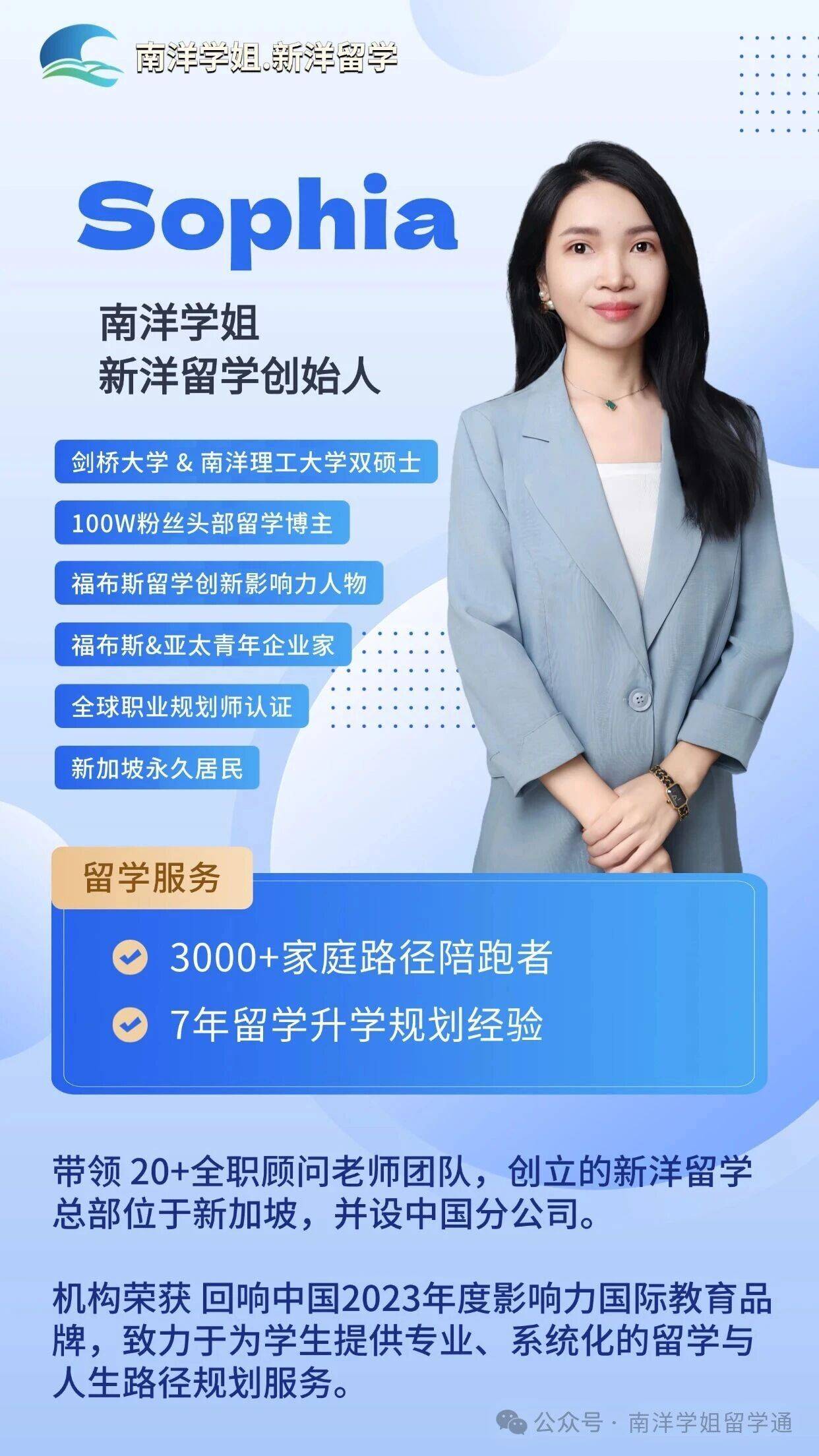 公司介绍与背景实力:南洋学姐(新洋留学)总部设立于新加坡,这一地理位置是其关键的战略优势。机构创始人Sophia(南洋学姐)是资深新加坡留学博主,拥有剑桥大学商学院硕士及南洋理工大学双硕士学位,同时持有全球职业规划师认证,为新加坡永久居民。其本人从留学生到创业者、从求职到获得永居的完整经历,使其对新加坡留学各环节有深刻理解。Sophia曾荣获福布斯多项荣誉,在社交媒体上拥有百万粉丝,长期通过内容输出分享新加坡留学干货,帮助众多家庭理清规划思路。在她的带领下,团队核心顾问均具备海外名校背景(如南洋理工大学、香港大学等),平均拥有5年以上留学申请实战经验,形成了一支专业、稳定的服务团队。